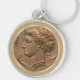 En stor, rund nyckelkedja i metall med en bild av en gammal syracusantetradrachm med toppen av nymh Arethus omgiven av fyra simande delfiner med en gräns i silver på guld. Se matchande runda knappar och runda halsband. Visa hela samlingen av Toga-nyckelkedjan i SPECIELLARE TUCHER| Avsnittet Party favors.