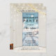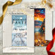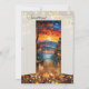 Pensionsfestinbjudan med en bild av öppnande dörrar som visar en väg med gnistrande snöflingor. Baksidan visar en boho chic-design med en färgrik festlig landskapsbild. Gyllene stiliserade stjärnor bidrar till en julstämning. Vacker för en pensionering vid årets slut för att fira vad som har uppnåtts och välkomna ett nytt år med nya början i livet.