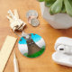 Tittar du en geologisk nyckelkedja? Den här produkten har en tecknad teckning av en söt vulkan med arg på ansikte. Han står högt över ett grönt landskap, sprider sten och aska i himlar.
