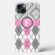 Argyle och damastast mönsterrosor, grå färgmonogramiPhone 6 cases. Detta gulligt, design presenterar flickaktigt ett argylemönster i rosor, grått, vit med intercrossing linjer för svarten och grå färgvitdamast på övredelen. Det finns ett rosa musikband över den och en cirkla med din monogram. Denna eleganta, flott och stilfulla design är fullständigt anpassadet. Du kan ändra bakgrundsfärg - grå färg- och textfärg som väljer från över 200 färger från Zazzle färg, kartlägger. Samtidat och modernt med en retro väderkorn.