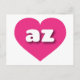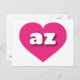 Det här vykortet har ett pulserande shock rosa-hjärta som innehåller fet, rundad, vit nedre fodral brev az, en lekfull version av förkortningen för Arizona, Grand Canyon. Baksidan av vykortet är tom och väntar på din anpassade text eller dina handskrivna känslor.