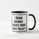 Rolig slogan på en mugg som säger "Jag Designar Byggnader. Vad är DIN superkraft?". Två Tons Mugg för en Arkitekt. Svart och vit fet text.