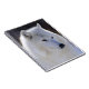 Fotografi av en arktisk varg som beskurits till huvud och bröstkorg tryckt på kant av bärbar dator.