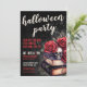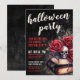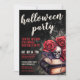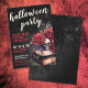 Välkommen gäster till din årliga Halloweenfest med denna mörka och stämningsfulla inbjudan som har en kuslig gotisk känsla. Designen har en sliten svart bakgrund med en blandning av röda och vita typsnitt, som kombinerar handskriven kalligrafi och en djärv serifstil för en dramatisk, vintageinspirerad look. I det nedre högra hörnet sätter ett gotiskt arrangemang av vintageböcker, djupröda rosor och en dödskalle tonen för en kuslig och elegant kväll.