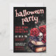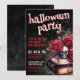 Välkommen gäster till din årliga Halloweenfest med denna mörka och stämningsfulla inbjudan som har en spöklik gotisk känsla. Designen har en sliten svart bakgrund med en blandning av röda och vita typsnitt. Överst är "Halloween Party" stiliserat i ett spöklikt typsnitt (inte handskrift) för att skapa den kusliga tonen, medan resten av texten kombinerar handskriven kalligrafi och fet serif-typografi för en dramatisk, vintage-inspirerad look. I det nedre högra hörnet bidrar ett gotiskt arrangemang av vintageböcker, djupröda rosor och en dödskalle till den kusliga atmosfären.