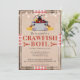Denna rustika design har en träd bakgrund med röd och vit band. Ovanpå det är en jute struktur med en tecknad illustrerad kräfta. Den röda och svarta serif- och handskrivna skriften är alla anpassningsbara till din händelse, oavsett om det är en kräftkokning, hummer, skaldjur eller fiskkokning. Fira din återförening, förlovning, födelsedag, examen eller någon annan händelse i stil!