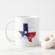 Arlington, Texas flagga karta kaffe mugg. Den här designen har "Arlington" i ett skript, calligraphy stil-teckensnitt i vitt med ljusa grått-konturer ovanpå karta i det tillstånd som är fyllt med Texas flagga. Det här hemekaffet mugg är ett underbart sätt att njuta av ditt kaffe och visa att du är stolt över att vara från Arlington, TX.