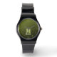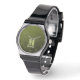 Arméns grönt, geometriskt nät mönster Monogram Wrist Watch. Monogrammad Personlig-gåva vaktar tillhörighet till honom med din anpassningsbar i början och namn. Arméns grönt olivgradients geometriska maska mönster. Arméns övertoning av grönt, geometriska nät, trianglar av mönster, ombre. Arméns grönt mörk olivnyck för solmanövrering, kamera. Det härmar naturliga militära landskap, hårdhet, uthållighet, uthållighet. Jordens undertoner är kopplade till naturen, jordning. Symboliserar militärt arv, utomhusbruk.