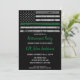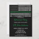 Tunt Grönt Line Militära inbjudningar till Pension eller inbjudningar till militära partier på väg bort. Inbjudningarna till Thin Grönt Line-armépartiet är perfekt för ett militärt pension, militära utplaceringar, militära välkomnande hem firande, militära studenten och soldater som åker bort party. Thin Grönt Line Flagga representerar all militär, armé, skydd av gräns, patrullering av gräns, skyddsofficer, parkens skogsvaktare, viltkrig, federala tillsatta lagar. Anpassa den här smala gröntens inbjudan med dina soldaters evenemang, namn och party. Se vår samling för matchning av militära gåvor från pension, militära gåvor från studenten, party favors och förnödenheter. COPYRIGHT © 2021 Judy Burrows, Black Hund Art - Med alla Höger reserverade. Inbjudan till Thin Grönt Line för militärarmén Pension