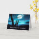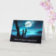 Ett jubileumskort från Kväll bröllop med ett romantiskt par som är silhuetterat mot måndagsljus, där St. Nick skapar sina ronder i bakgrunden.