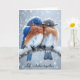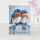 Två Östrors bluebirds med vibrerande blått och orange fjädrar är nära sammanflätade på en gren som täcks av snö under ett lätt snöfall. Texten kan redigeras.