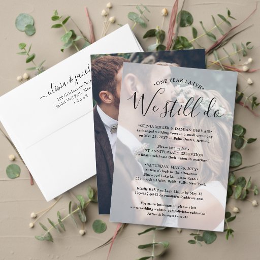 Om oväntade omständigheter har lett till att bröllopsmottagningen har skjutits upp är den första årsdagen en perfektens möjlighet att fira ett år senare. Familjen Inbjudan och vänner till en elegant på 1:a årsdagen party med den här snyggten, den moderna 7-fotosamlingsinbjudan. Alla formuleringar är enkla att anpassa, inklusive citat som lyder "ett år senare gör vi fortfarande". Anpassa tiden mellan ceremonin i bröllop och årsdagen i party, oavsett om det bara är några månader eller några år. Ta med valfri information, t.ex. datum för giftermål, lövförnyelseplaner, information om party efter utresan, plats för bröllop-ceremonier, adresskod, osa, webbplats osv. (IMAGE PLACEMENT TIP: Ett enkelt sätt att centrera ett foto exakt på vilket sätt du vill är att flytta det till skörd innan det laddas upp till Zazzles webbplats.) Den moderna minimalistiska svartvita designen har sju bilder av de nyfödda, trendig handskrivet manusgrafi och chic typewriter stil typografi. Vare sig du gick, hade ett mindre miniminivå eller mikro-bröllop, eller så var du tvungen att lägga om din speciella dag i firande på grund av ett omfattande pandemirelaterat uppskov, desto lyckligt nog när party fortfarande kan komma igång. Grattisar till bruden och brudgummen!