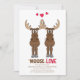 Söt nyckfull älg som säger "det måste vara kärlek". Denna design har årsdag söta nyckfulla roliga roliga inbjudningar, perfekta för bröllopsdag årsdagar fester, en firande sammankomst, en humor älg djur hjärta kärlek, det måste vara kärlek citat, ett kreativt unikt coolt typografi teckensnitt, trendig stilren modern ljus stil, par make maka, röda tecknade grafiska illustrationer hjärtan, söt rolig årsdags inbjudan