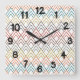 Den här väggklockan har en konsdeco-design uppåt och nedåt Vs i färg av orange, teal, guld, svart, röd, brun och grått.