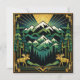 Denna djärva födelsesignalering har en slående Art Deco-bergslandskap som ramas in av geometriska ramar i djupgröna, marinblå och gyllene nyanser. Snötäckta toppar reser sig under strålande solstrålar, medan höga barrträd skapar en symmetrisk skogsmiljö. Två stiliserade älgar står vid basen och ger kompositionen en särpräglad vildmarkskänsla. Den centrala crempanelen framhäver elegant, skrivet typsnitt för Birthday Party, i kombination med rent modernt typsnitt för evenemangets detaljer. Med sina strukturerade linjer och rika färgpalett blandar detta konstverk vintage-glamour med robust charm för en sofistikerad skogsutflykt.