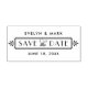 Meddela bröllop i stil med den här vintagen inspirerade Art Deco till att spara datumet frimärke som har en dekorativ ram-design, vintage stil typsnitt och anpassningsbar som kan vara personlig med briden och trimningen namn och bröllop.