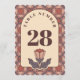 "Förhöj din receptionsdekoration med dessa eleganta bröllopsbordnummer som har ett sofistikerat Art Deco-motiv med glasmålade blommor. De varma, jordnära terrakotta- och mauvefärgerna ger en perfekt retro-modern estetik för ditt bordsscape. Bakgrundsmönstret är 100% färgjusterbart, så att du enkelt kan anpassa nyanserna för att matcha dina bröllopsblommor och linne. Ett vackert och praktiskt sätt att guida dina gäster i stil."