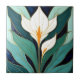 This ceramic tile features a stylized calla lily in a classic Art Deco style, with graceful white petals, warm golden centers, and layered green and teal leaves set against a deep blue background. The artwork is printed on a smooth tile surface, keeping the colors crisp and the lines clean. It works beautifully in many settings: displayed on a tabletop or easel, added to a wall arrangement, incorporated into kitchen or bathroom tilework, used on stair risers, or included in covered outdoor spaces away from direct sunlight. It can also be used in furniture inlays, framed as wall art, or grouped with other tiles to create a striking pattern. A versatile piece that brings a touch of vintage charm and botanical elegance to any space.