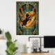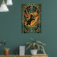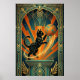 A triumphant black cat silhouette holds a stylized golden fish trophy atop a teal pedestal, surrounded by clean deco architecture and orange highlight details. This celebratory 1920s art deco composition brings playful sophistication to kitchens, dining areas and casual spaces where cat lovers appreciate elegant, personality‑filled wall art.