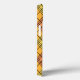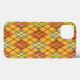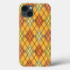 Den här telefonväskan har en konsthänvisning av diamantformer som är tillverkade av överlappande vinklar i färgaden svart linjer i skuggor av orange och gult med diagonalt svart linjer skapar designen som argyle
