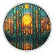 Gorgisk bild av Art Deco-nedfläckaden av en imaginär glaseffekt med Sol, planeter, berg och sjö. TRYCKT BILD INGEN FAKTISK MOR AV PEARL, STAINERAT GLAS, GEMS ELLER GULD METALL