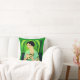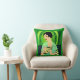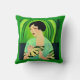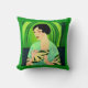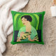 Pillow i en modern, halvabstrakt, Art Deco porträtt i dam i en kimono, som håller fläkt, mot bakgrund av en grönt av abstrakt av en i en .