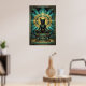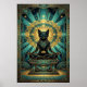 This majestic art deco black cat sits enthroned on a stepped pyramid pedestal beneath a golden sun disc and teal geometric jewelry motifs. The symmetrical composition and rich 1920s palette evoke ancient luxury perfect for exotic interiors, offices and cat lovers seeking sophisticated, culturally inspired wall decor with timeless appeal.