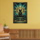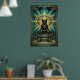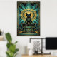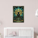 Denna majestätiska art deco svarta katten sitter på en trappstegspyramid under en gyllene solskiva och teal geometriska smyckesmotiv. Den symmetriska kompositionen och den rika 1920-tals paletten frammanar en urgammal lyx som passar perfekt för exotiska interiörer, kontor och kattälskare som söker sofistikerad, kulturellt inspirerad väggdekor med tidlös charm.