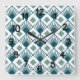 Den här väggklockan har en konsdeco-design av tealdiamanter med diagonaldiamanter av linjer och grönt av alfanummi på en fält av vitt.