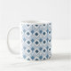 Mugg har en konsdeco-design av dammiga blå diamanter med diagonalt linjer och mörk blått diamanter på en fält av vitt.