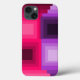 Den här telefonväskan har en konsthändelse av fyrkanter i rosa och lila där varje lagrar överlappar lagrar före den.
