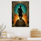 A classic portrait of Jazz Age sophistication and mystery. This striking artwork features a black silhouette of a gentleman in a top hat and formal coat, holding a cane while standing confidently upon a tiered Art Deco pedestal. Framed by a radiant golden sunburst that transitions into a deep teal archway, this piece captures the timeless glamour of a 1920s evening. Perfect for a modern office, home bar, or as a statement piece in a minimalist interior.