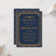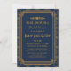 De här inbjudningskort för möhippa har en blå palett och en färg i guld, ett geometriskt ram, ett geometriskt mönster och andra stilistiska detaljer som alla inspireras av Art Deco och de kommande tjugo åren. Du kan anpassa exempeltexten till fälten.