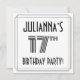 På framsidan av den här elegantens sjuttonde födelsedag/partiinbjudan finns ett eget namn, ett finare art deco-utseende inspirerat nummer "17:e", meddelandet "FÖDELSEDAGSFEST!" och ett gräns mönster som består av linjer. Baksidan innehåller information om händelsen, t.ex. datum, klockslag, ställe och all annan personlig som kan vara användbar. Luxuriös, elegant, redigerbara inbjudningar som dessa kan användas till att inbjudan deltar i en födelsedagsförsamling som hålls för att hedra någons 17-årsdag. [~Z0000614]