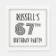 Den här eleganten och 1920-talet/1930-talet inspirerade stil till sextiosjunde födelsedag med papper napkin-design har ett anpassat namn, ett okomplicerat konst deco stil inspirerat nummer "67:e", meddelandet "FÖDELSEDAGSFEST!" och ett gräns mönster som består av linjer. Pappra servetter som dessa kan användas i en födelsedagsfest till någon som firar sin sextiosjunde födelsedag. [~Z0000613]
