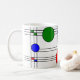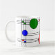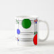 Mugg har en nedfläckad-glas--konsthög av svart linjer och röd, blå och grönt fyrkanter och cirklar.