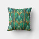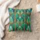 Art Deco-inspirerad kudde med geometriskt grönt och guldfläktsmönster, fram- och baksida. Designen frammanar en vintage, elegant och livfull känsla.
