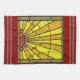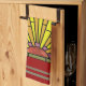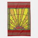 16-tums x 24-tums kökshandduk med en bild av Art Deco-nedfläckad glas med gyllene ljusstrålar från en röd-orange sol. Röda och grönt rand gräns. Se matchande trasa-napkin, papper cocktail-napkin, trasa bordstablett, papper bordstablett och underlägg. Se hela 20-talets kötthandling i LIVSMEDEL/BEV | Linens-sektion.