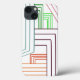 Den här telefonväskan har en konsthandledning av linjer i lila, rosa, orange och blått.