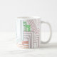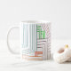 Mugg har en konsthändelse av linjer i lila, rosa, orange och blått.