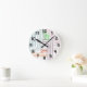 Den här väggklockan har en konsthändelse av linjer i lila, rosa, orange och blått.