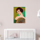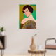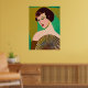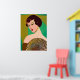 Poster i en modern, halvabstrakt, Art Deco inspirerade porträtt av ett dam som är på modet och som håller fläkt, mot bakgrund av en som är på jad-grönt och guld-färgad