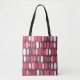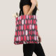 Den här väskan har en konsthugg som är gjord av ovaler och halva ovaler i vitt och skuggor av rosa på fält av mörk grått.