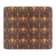 Art Deco pattern with fan-shaped motifs in orange and dark purple. The geometric design is repetitive, reflecting a vintage, elegant style.