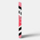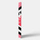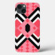 Den här telefonväskan har en konsthandlings quilt-inspirerad design av diamantformer i svart, vitt och rosa på en fält av vattenmelon.