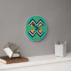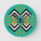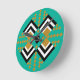 Den här klockan har en konsdeco quilt-inspirerad design av diamantformer i svart, vitt och brunt på fält i teal.