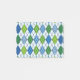 De här PostIT-anteckningarna har en konsdekodesign av diamantformer som är tillverkade av överlappande vinklar i färgaden svart linjer i skuggor av blått och grönt med diagonalt svart linjer skapar designen som argyle