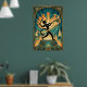A whimsical character made of vintage film strips, swinging a film reel like a bat against a vibrant cityscape. A playful tribute to early animation and the magic of movie-making in a classic Art Deco frame.