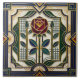 Step back in time with this stunning Art Deco-inspired ceramic tile, featuring a stylized red rose at its heart. The intricate design boasts a rich palette of deep blues, lush greens, and gleaming gold accents against a crisp white background, creating a captivating visual. This exquisite tile captures the essence of the Art Deco movement, characterized by its geometric patterns and floral motifs, making it a perfect statement piece for any space. Elevate your home decor with this elegant and timeless work of art, adding a touch of vintage sophistication and charm to your walls or backsplash. Its detailed craftsmanship and vibrant colors are sure to impress and become a conversation starter.