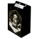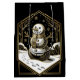 1920s Art Deco style with bold gold lines of a classic snowman with a cozy scarf wrapped around their neck, standing in a snow-covered yard with bare, frosted trees, delicate snowflakes falling, and children's footprints marking fresh powder, evoking winter magic and fun.